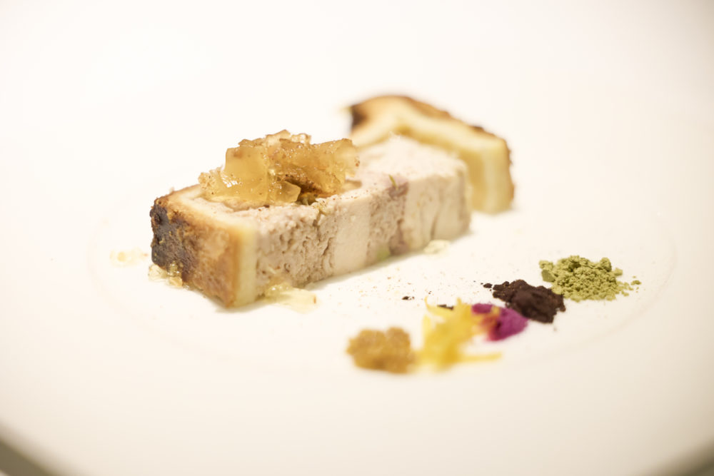 もうひとつのハイライトは、くいまーる豚と久米島赤鶏を使った「パテ・アン・クルート」。5種類のコンディメントが添えられており、それぞれ次のようなラインナップだった。琉球よもぎ(ハママーチ)の粉末、発酵&焙煎を経たカカオの粉末、生の紅芋を乳酸醗酵、冷凍して乾燥させた粉末、沖縄のオートー(沖縄の在来のみかん)のコンフィ、そして白菜のお酢に漬け込んだカラシ菜の種。香味や酸味、発酵由来のニュアンスを重ね、ひと口ごとに表情が変わり、食べ進める手が止まらなかった。
