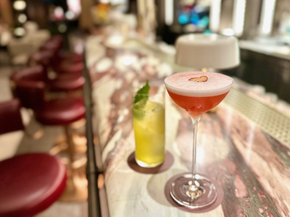 シグネチャーカクテルふたつ。左:「Time for Tea」(¥3,300)かつて新宿駅で次の列車を待つ間に利用した茶屋を表現したカクテル。右:「SANDO」(¥2,900)。高級フルーツパーラーの「フルーツサンド」から生まれた“ミルクパンチ”スタイルの一杯。