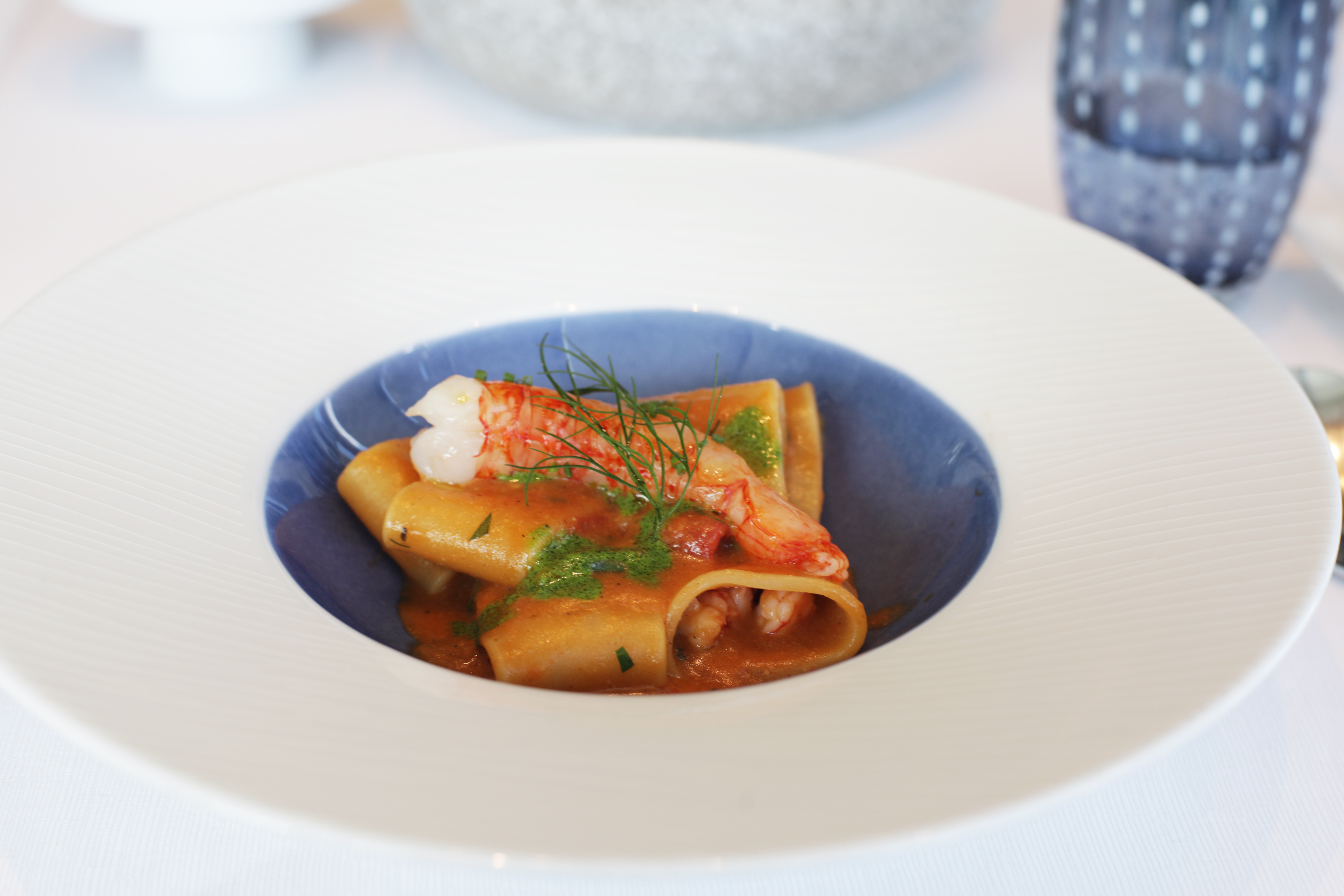 海老とトマトソース&フレッシュバジルのペーストでまとめたマンチーニ社のパッケリ。素材の甘みと香りが素直に重なる。