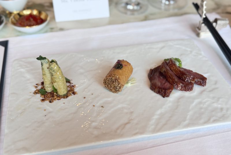 まず左は、たけのこを模した「キノコの湯葉包み焼き」。マッシュルームと豆苗を湯葉で巻き、生胡桃を“土”に見立てて周りに敷いた、春に芽吹くキノコを表した見た目も楽しい一皿でした。中央は、アボカドとカニを春巻きの皮で包み、香ばしい胡桃をまとわせた「蟹肉とアボカドの冷菜 シュレンキキャビアのせ」。上にトッピングされたキャビアの塩気がアボカドのクリーミーさと絶妙にマッチしており、皮のパリッとした食感も印象的でした。右は、山形産A5ランクのリブロースを使ったチャーシュー。広東料理では豚肉が定番ですが、日本ならではの上質な牛肉を生かすべく、あえて牛を選んだとのこと。とろけるような脂とやわらかな肉質が記憶に残る一品でした。