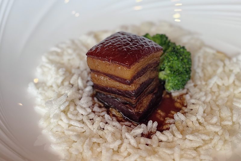 豚バラ肉の醤油煮込みは、運ばれてきた時からそのぷるぷるで柔らかで美しいビジュアルに感嘆の声が上がるでしょう。こちらはジャン氏が手がけた料理で、3種のネギを煮込んだ香味油にネギ生姜出汁と紹興酒を合わせ、じっくり24時間かけて仕上げた逸品。通常は白米と合わせるところを、今回は揚げ米とともに軽やかにいただくスタイルでした。柔らかなお肉と、お米のサクサク感の絶妙な食感はもちろん、そしてその旨みが詰まったソースを余すことなく楽しめる工夫に、料理人の心意気を感じずにはいられませんでした。