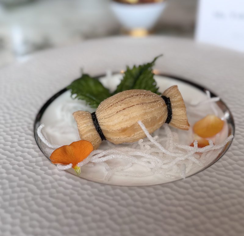 デザートは2種類。杏仁とミルク、生クリームを合わせ、桜パウダーでピンクに仕上げたソースをかけた小室氏の「杏仁豆腐」は、優しい味わいでした。燕の巣のトッピングも贅沢感を添えてくれます。そしてジャン氏によるデザートは、伝統的な広東菓子「塩漬け卵黄入りパイ」。キャンディのような遊び心あるプレゼンテーションが可愛らしいですよね。しっとりしていて、心地よい甘味でした。