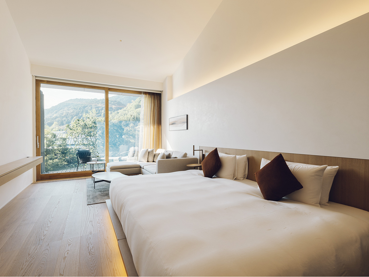 全21の客室のうち、一階に位置する客室では水の流れる音が心地よく、二階の客室は大きな窓と天井高4.5メートルという開放的な空間です。対面する壁はひとつの面に日本の漆喰を、反対側の壁にはイタリアのスタッコ・アンティコを使用するというこだわりも。インテリアはイタリアの高級ブランドのものを多数採用し、引き算の美学で、インスピレーションを掻き立てられる洗練された、居心地のよい客室です。