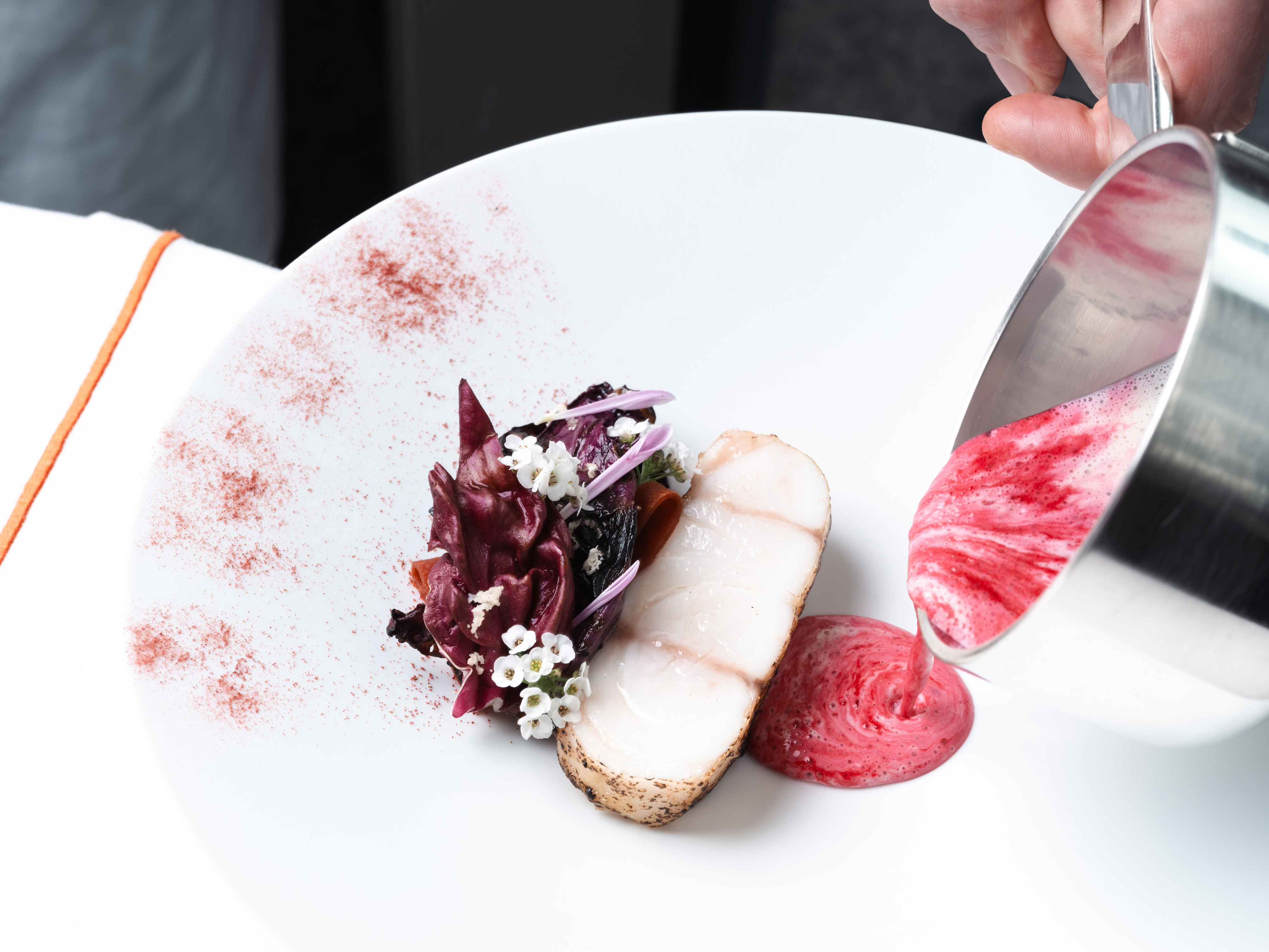 ビーツの鮮やかなピンク色が効果的に使用された、五感が刺激される魚の一皿。
