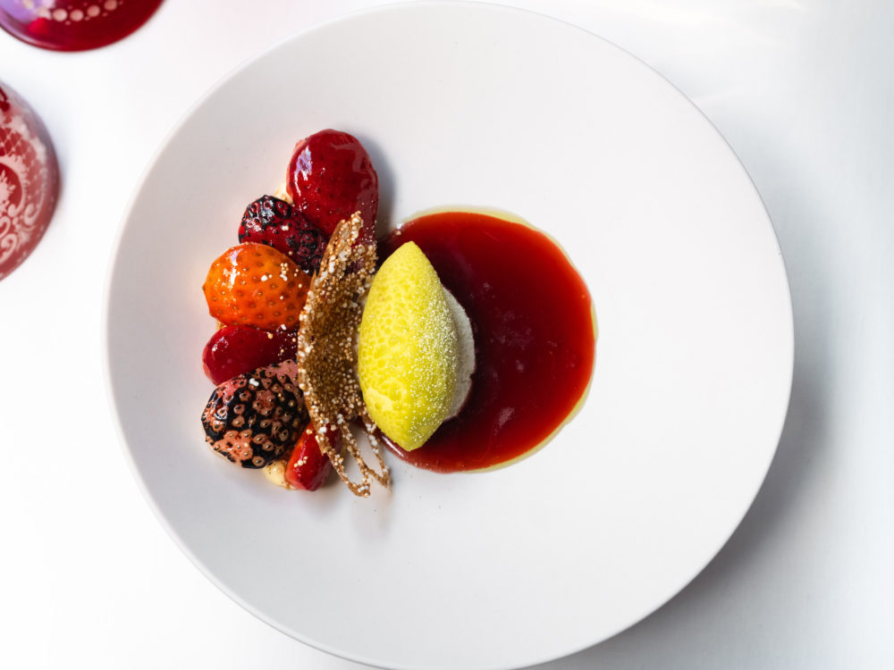 中央のわさびのジェラートと相まって、甘すぎることのないあっさりとしたデザートだった。焼いたり、キャラメリゼしたり、さまざまなスタイルのイチゴを添えて。