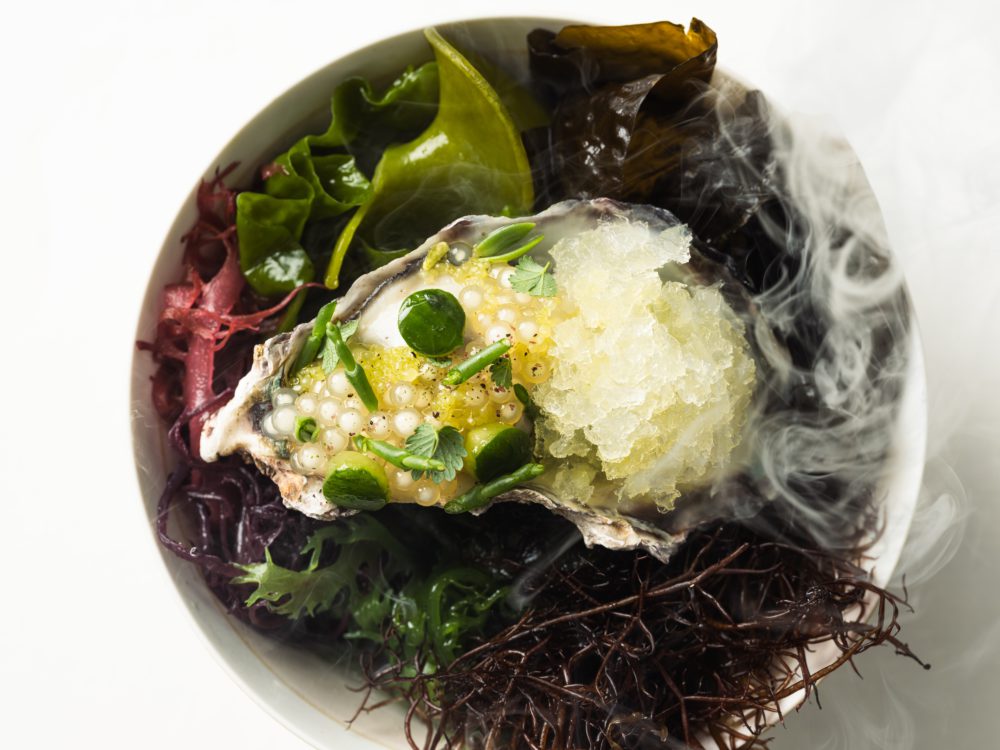続いて登場したのは、牡蠣を使ったアミューズ。軽く湯通しした牡蠣に、きゅうりや硬めに茹でたタピオカ、ジントニックのかき氷を合わせ、苦味と酸味、旨味に、さまざまな食感が合わさり、その見事な合体に、味覚に集中すべく思わず目を瞑ってしまいました。ドライアイスとともにいくつもの海藻が敷き詰められたプレゼンテーションは、豊かな磯の香りも相まって、まるで海辺で食事を楽しんでいるかのような臨場感さえ与えてくれました。