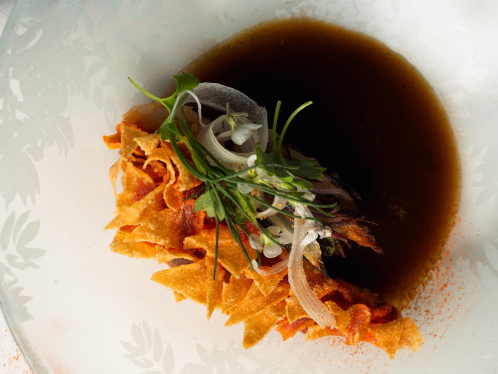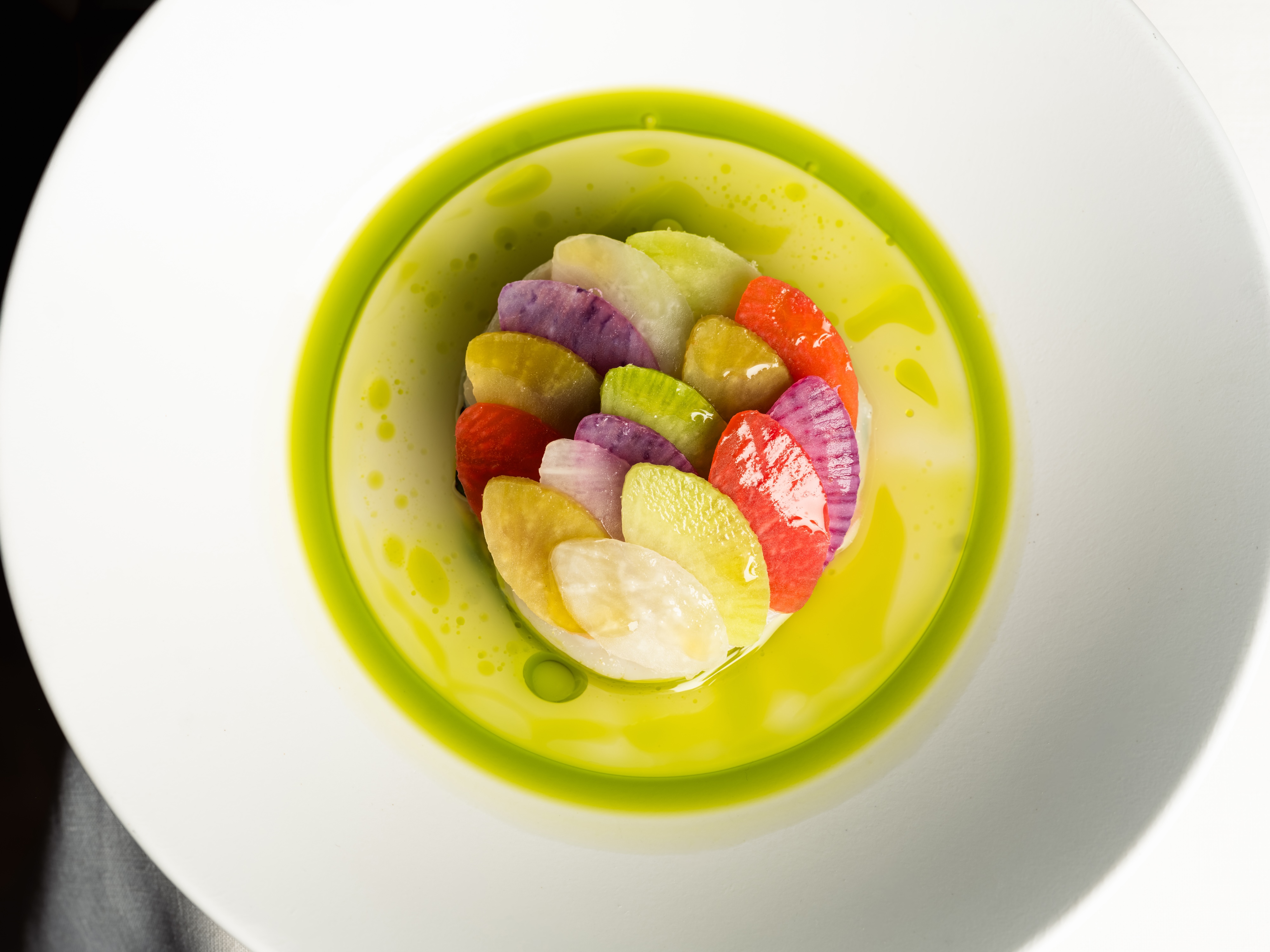 二十日大根をはじめ、緑色や紫色のカラフルなラディッシュは酸が効いていて、柚子胡椒とジャスミンのパウダーでマリネされたホタテ(貝柱だけでなく、ヒモも)のやわらかな食感や甘味と、ラディッシュのシャキシャキ感と見事にマッチしていました。すべてが程よく合わさり、あとから追いかけてくるナスタチウムの微かな辛味も相まって、その多層的な味わいに感動したのは言うまでもありません。