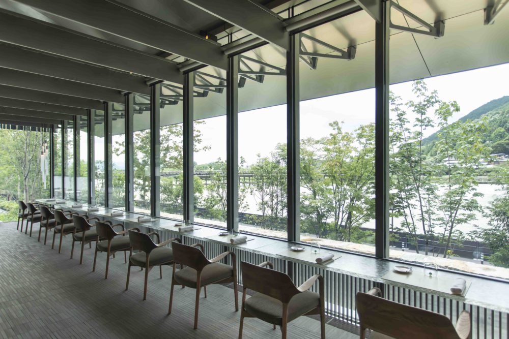 上質なアート作品で彩られた館内のさまざまな場所からは、嵐山の景色をも楽しむことができ、窓の外に広がる絵葉書のような風景に、ついうっとりしてしまいます。